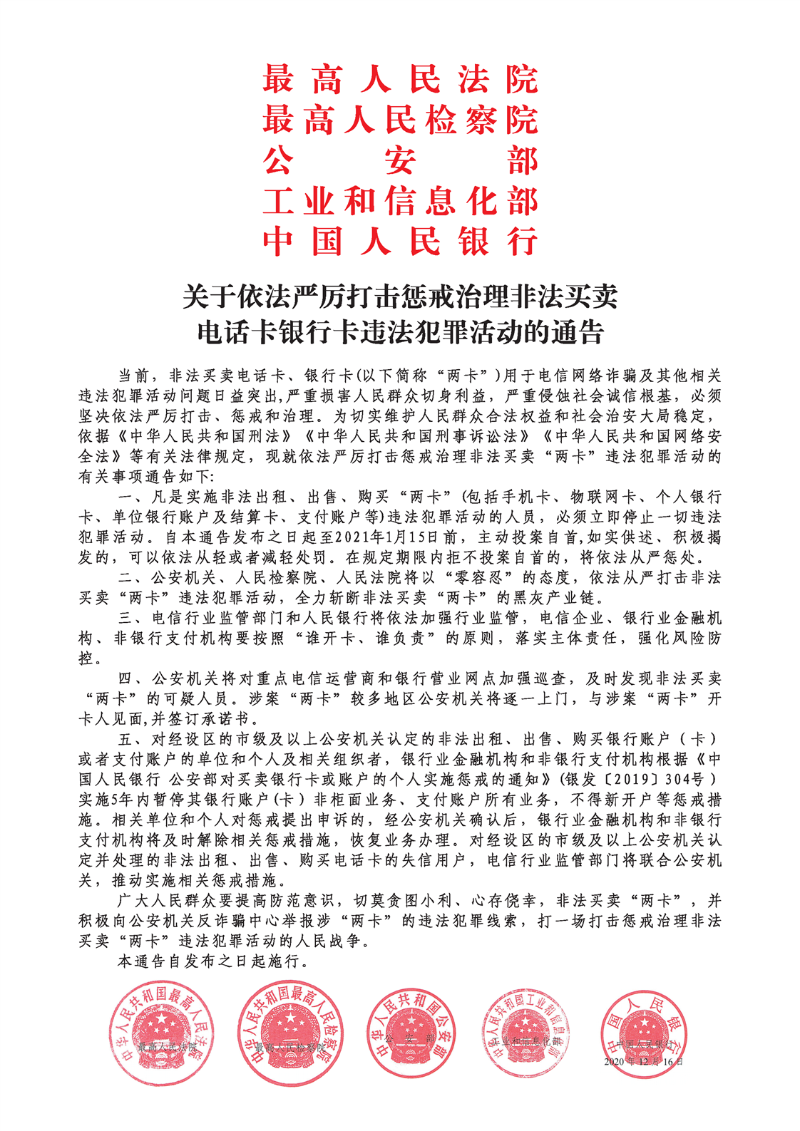 關(guān)于依法嚴(yán)厲打擊懲戒治理非法買賣電話卡銀行卡違法犯罪活動的通告